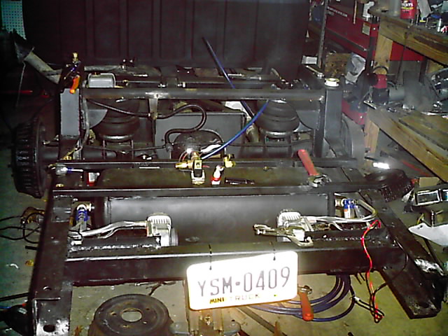 custom wishbone 3 link bags on bar setup, RE7s all around, tubular upper and lower arms, smc 3/8" valves, 1/2" lines,