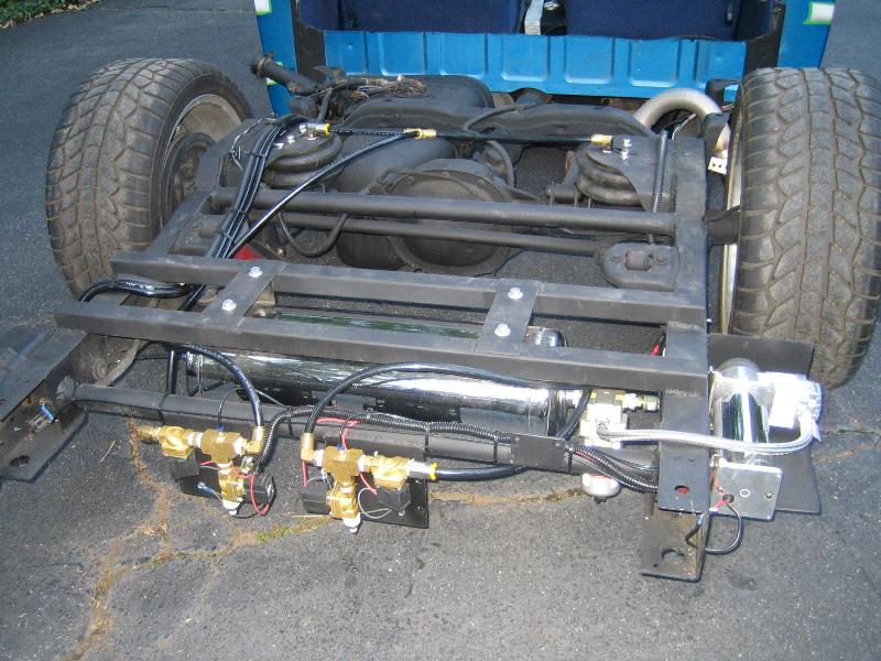 Custom 3 link with Panhard Bar (everything but the link bars was done over by me), 2600 Stones all around, 5 gal chrome tank under bed, Viair 450 Under bed, 4 SMC 3/8" Valves, ART upper and lower control arms