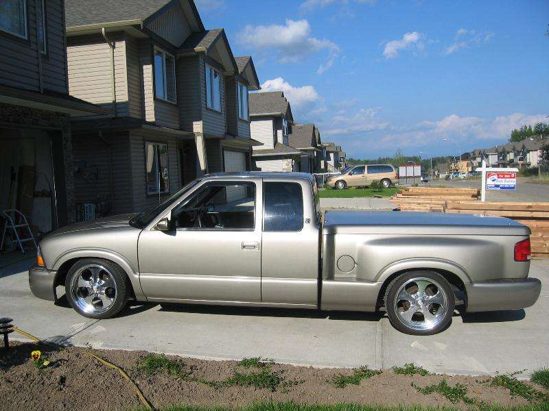 envoy bumper, with fog lights, no grille in bottom bumper yet... custom verticle grille, painted door handles, shaved tailgate, shaved tonneau cover handle, added 2 locks located at rear corners, sport mirrors painted to match truck, billet sport antenna