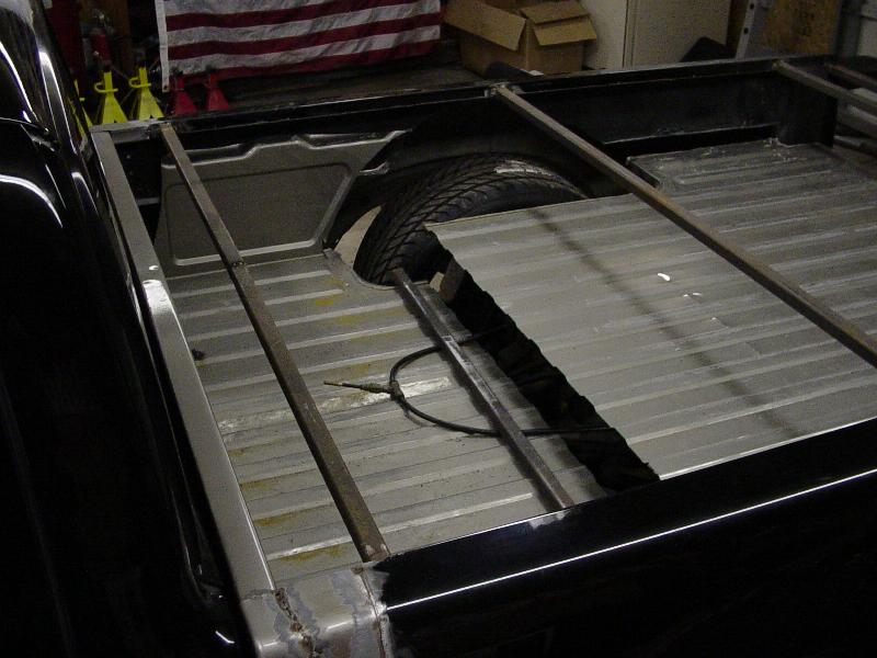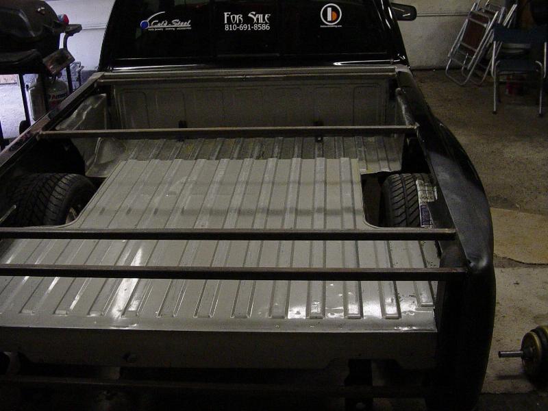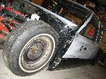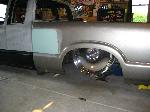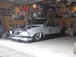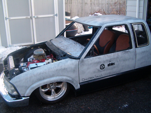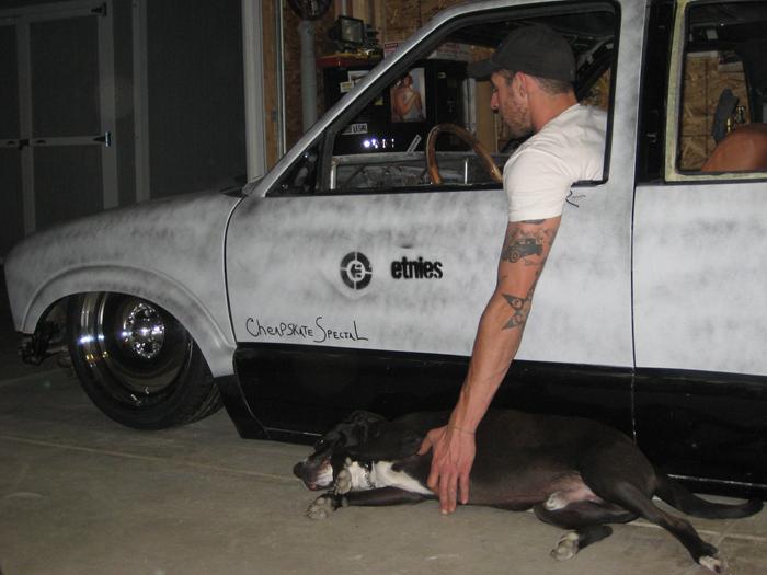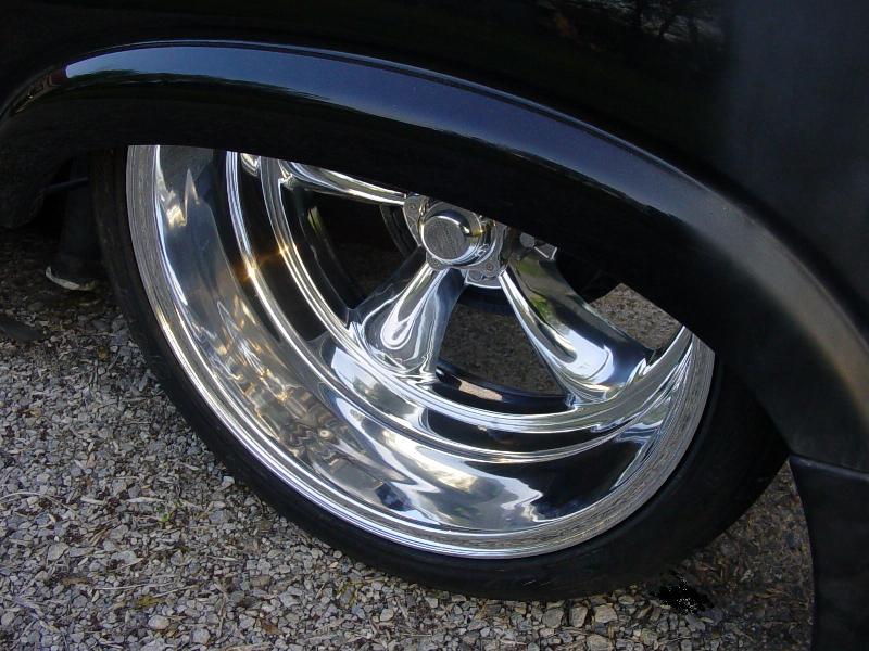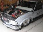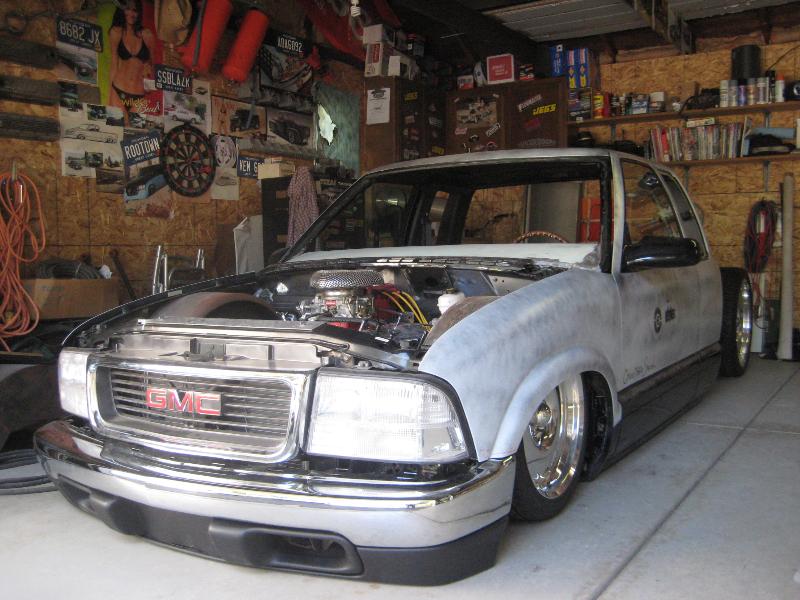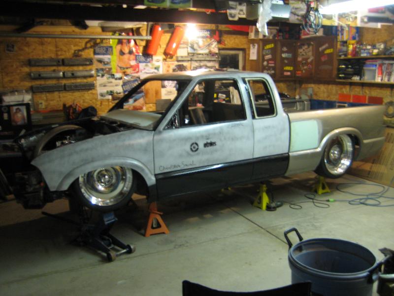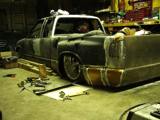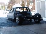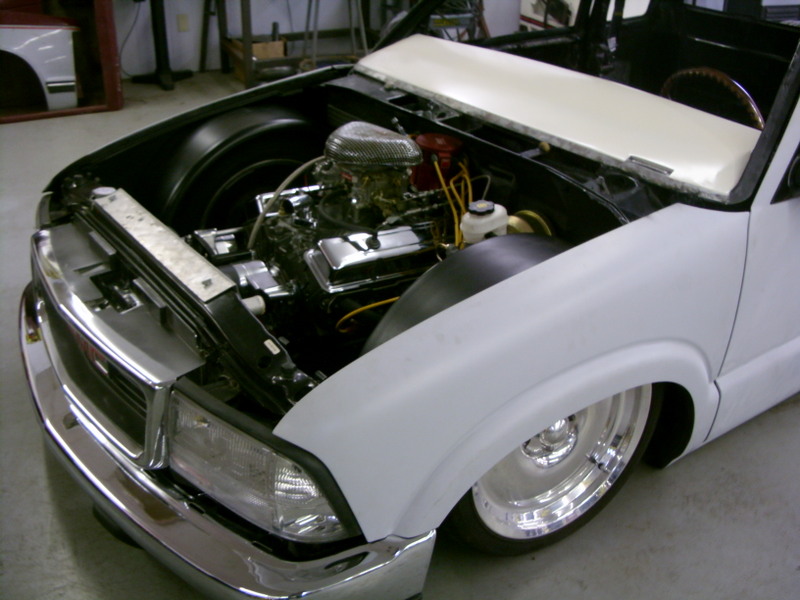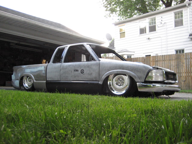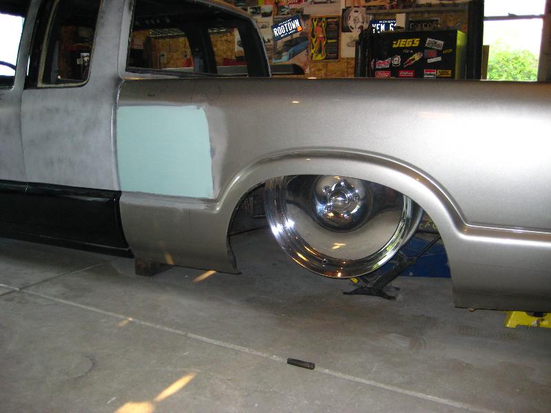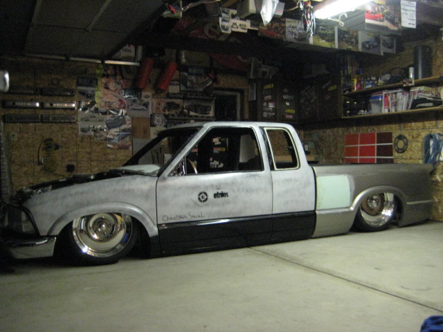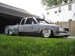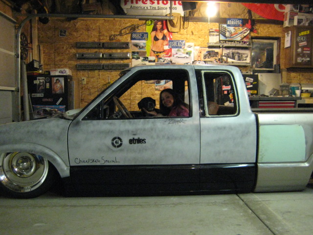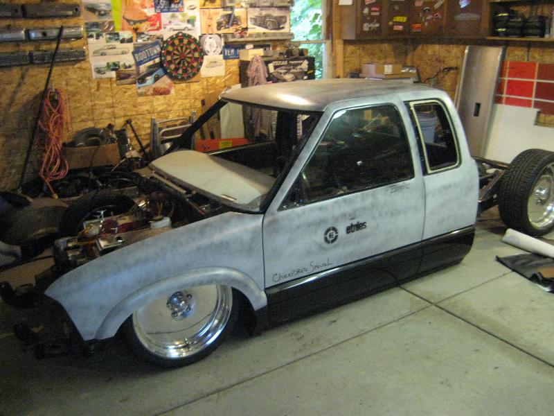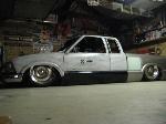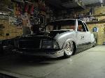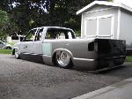 HotRod Flatz gunsmoke metallic paint soon, shaved everything except taillights, 3" traditional bodydrop, trailer fenders up front, Thorbecke Bros. tubs out back, roll pan w/centered plate box, stock hood, grille, and taillights, chrome smoothie bumper.