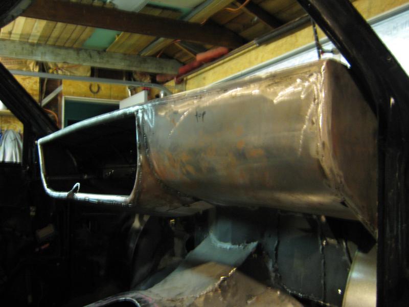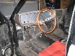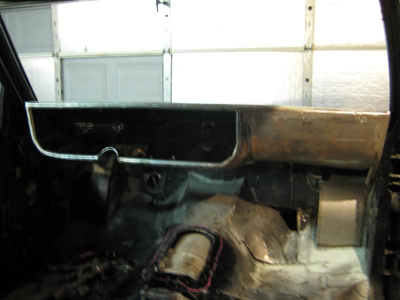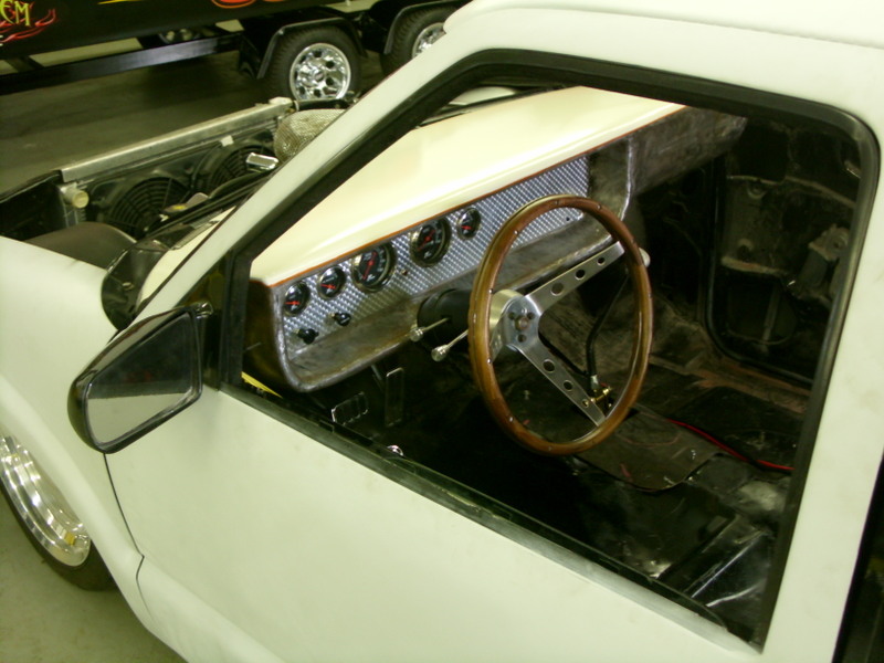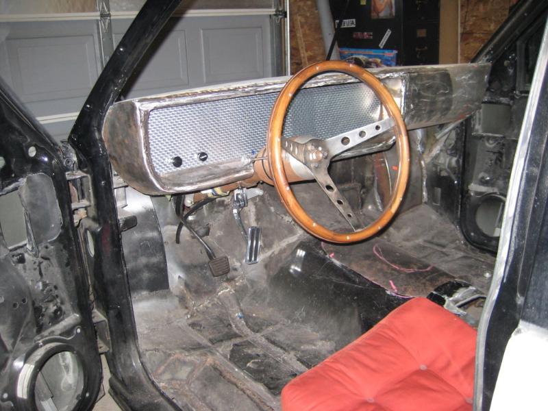 metal dash w/some pearl paint soon, chopped seats, lowered and moved back wrapped in brown and black vinyl(soon to be plaid), Ididit tilt column, walnut grip steering wheel, Need to figure out what gauges to run cause the dash is ready