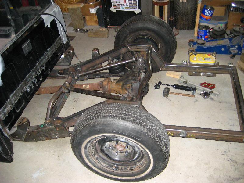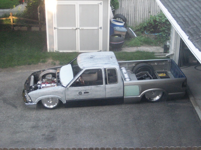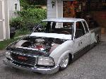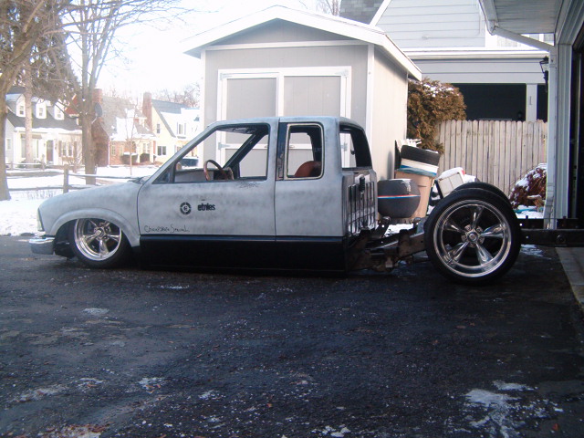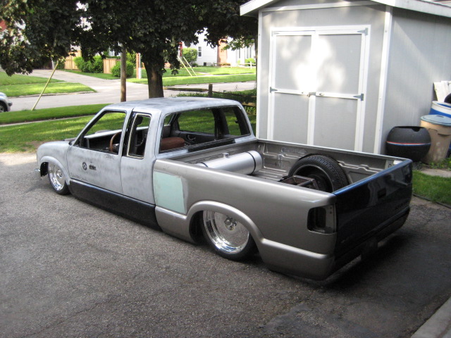 back halved w/ 3x2 and 1 1/2" tubing, 4-link w/bags on lower bars, 13" of lift, Slam Specialties bags, ART control arms, MIC manual valves, 2" spindles, Shocks (what kind?)