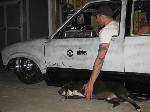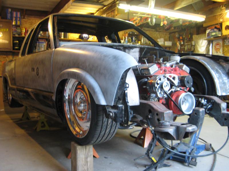 small block chevy under stock hood, Mallory HEI ignition, March serpentine pulleys, electric water pump, New vega box (manual), modified Hedman headers, Afco circle track solid motor mounts and mid plate, 700R4 trans, Hurst Quarter Stick, Howe Racing radiator, Twin electric fans, 7" booster, F-body master cylinder,14 gal MAS spun aluminum fuel tank, holley mech. fuel pump, Torker II intake for now with out the hood on, change to performer RPM (already have) when I run a hood, Barry Grant 650