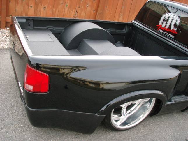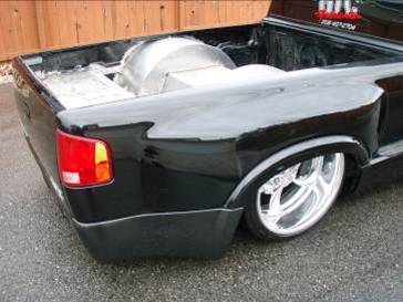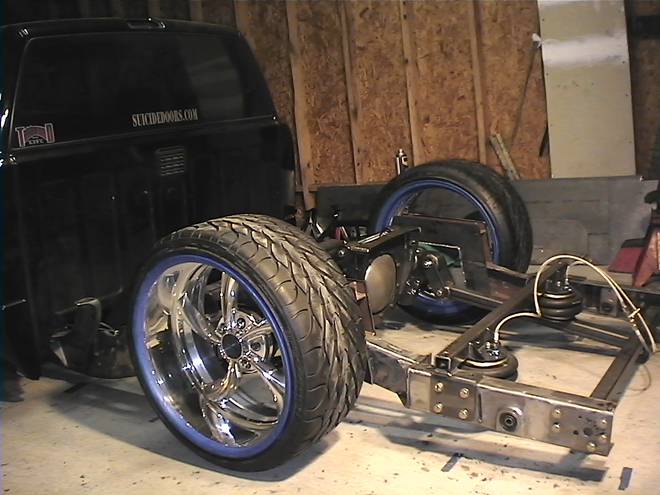 Baer rear disc's, Braided brake line's, 5-link Set-Up, Narrowed stock frame 5 1/2 inches, (8) 1/2 parker valves, (2) silver Air Zeniths,(2) 5 gallon SD tanks powdercoated titanium, Narrowed rearend powdercoated titanium, Shaved & smoothed frame rails,1/2 air line, 1/2 dump control valves, PTC fittings, Conti 2600's Back, Slams Up Front.