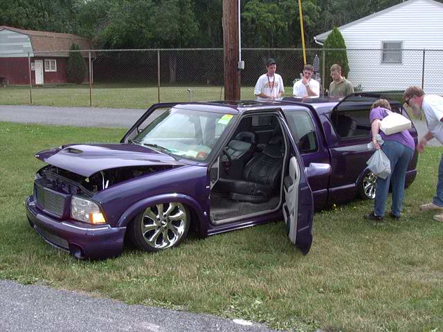 3 & 3/4 Inch Body Drop, 2000 gmc envoy front end, Shaved Firewall, Notched Firewall To Fit The 17'S, Factory Purple Paint, Sunroof, Billet Grille Insert, Leer Cap, Full Walk Through, Sir Michaels Smooth Roll Pan, Shave Tailgate With Frenched In License Plate Box, Shaved Tailights, Shaved Suicide Doors, Shaved Antenna, Flush Led Tailights , Ram Air Hood