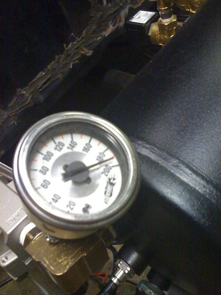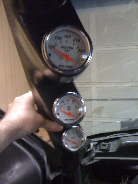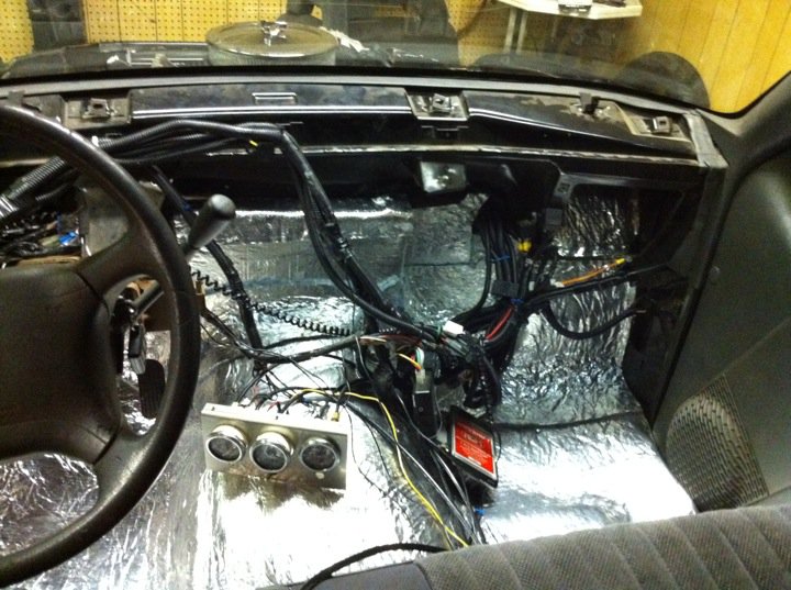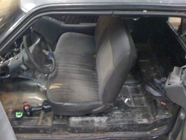 bench seat out of a 1st gen dime, pillar with autometer engine gauges, compushift display, heat barrier on floor and firewall, black carpet
