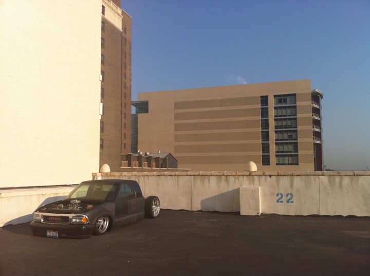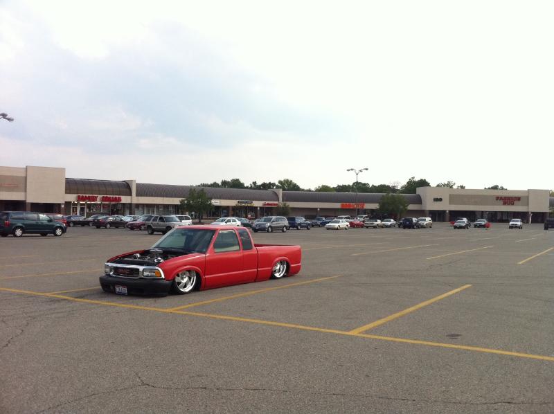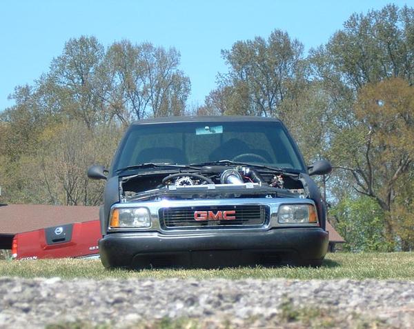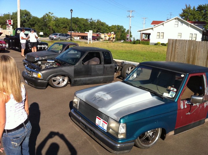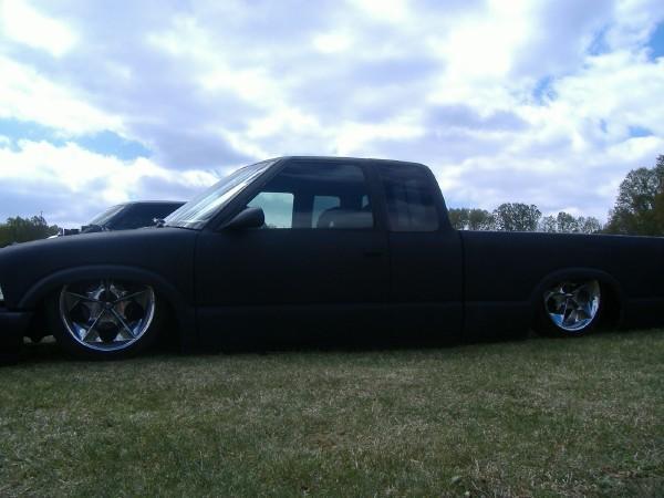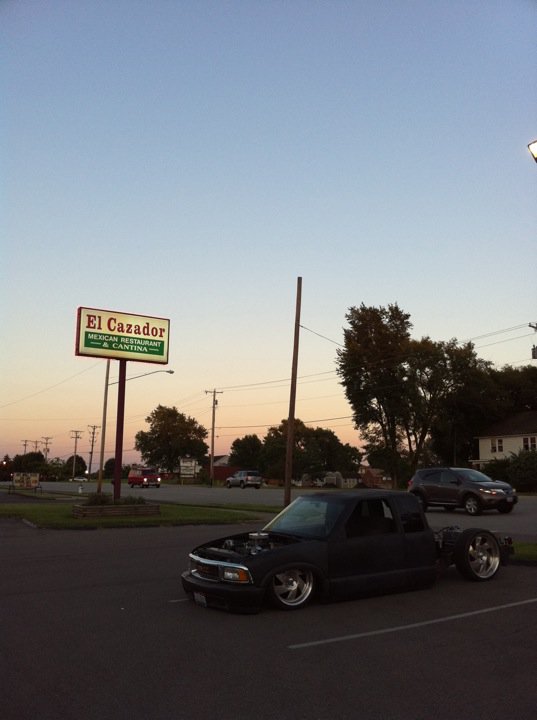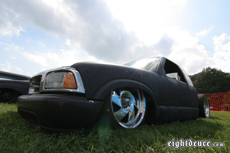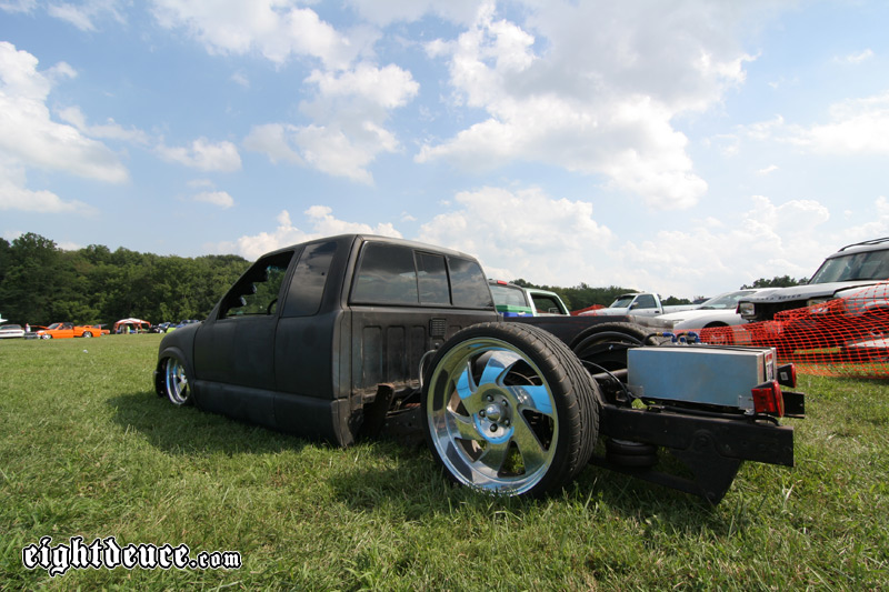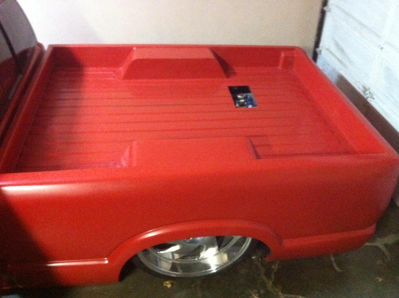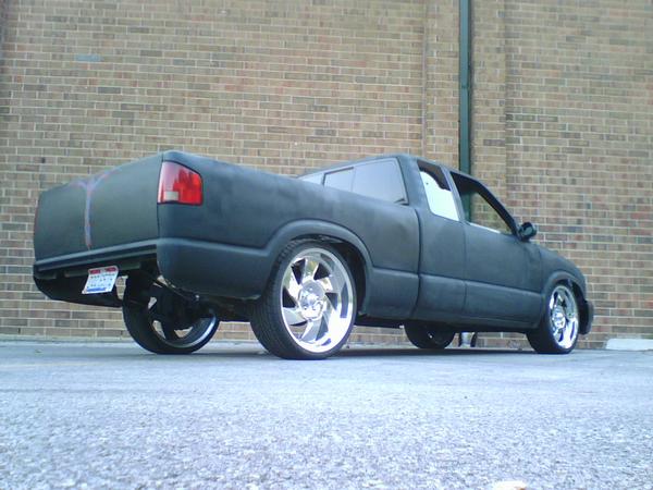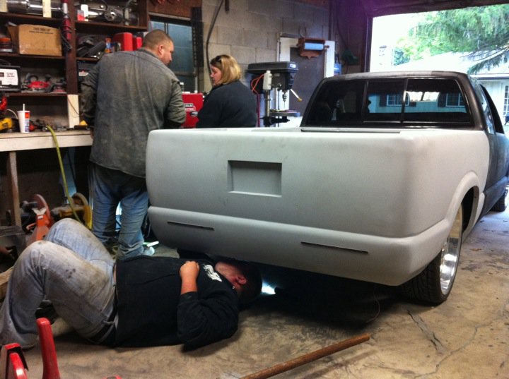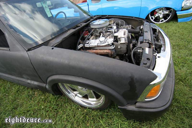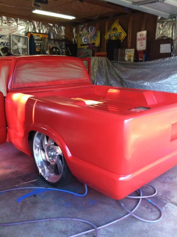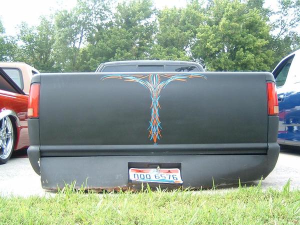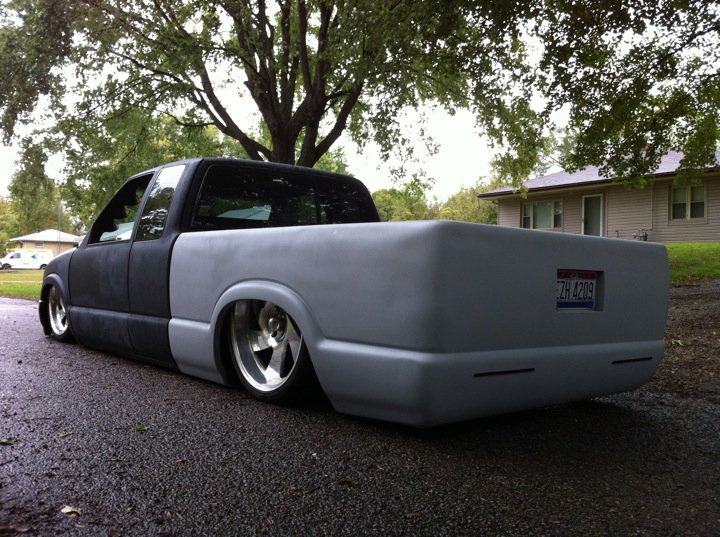 traditional bodydrop to the rockers, shaved door handles, 3rd brake light, full grant kustoms skin with centered plate box & led's, gas door, tail lights, & mirrors, raised stock bed floor with custom tubs, chrome sonoma grill, 98+ jimmy bumper, goodmark 2" steel cowl hood