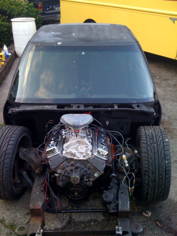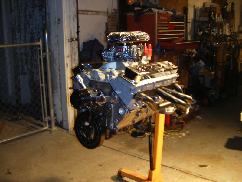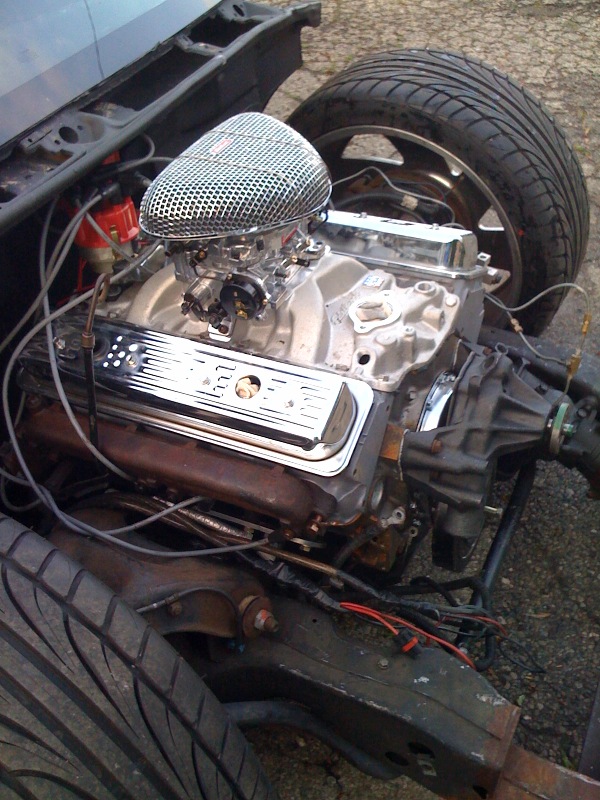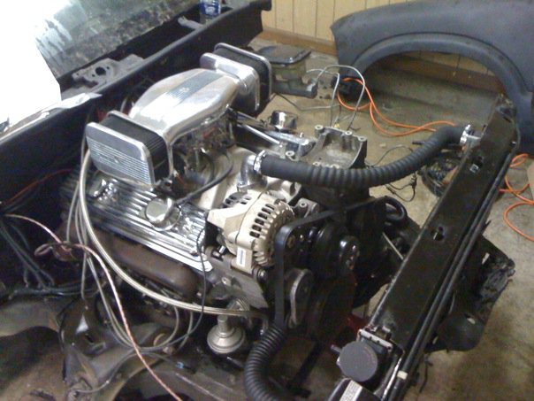 350 bored 0.030 over, comp cams thumper cam, flat-top pistons, high-torque starter, edelbrock performer intake manifold, edelbrock thunder 650 carb, 10" chrome air cleaner, olds rocket exhaust manifolds, JTR stealth motor mounts, small hei distributor, powermaster ignition coil, chrome center bolt valve covers, custom bent exhaust with 2 thrush cherry bomb style mufflers, summit vacuum reservoir, 17gal rci fuel cell, COMPUSHIFT controller for 4L60E tranny, (3) electric fans, shaved/recessed firewall with tubs, custom alternator bracket