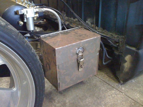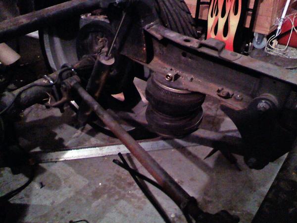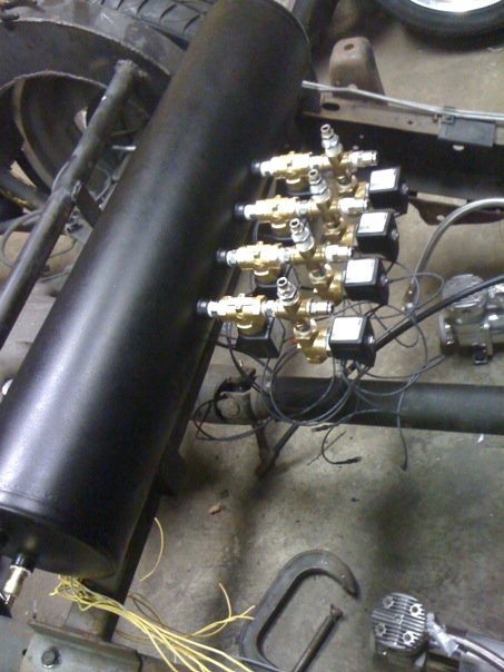 can-do specialties reverse 4link, slam re-7 bags, (8) 3/8" parker gold valves, 5 gal skinny tank, (2) viair 480s with water traps, 3/8" line, 1/4" line for gauges, avs 7-rocker switchbox, air lift gauges, belltech drop spindles, stock arms, rear shocks