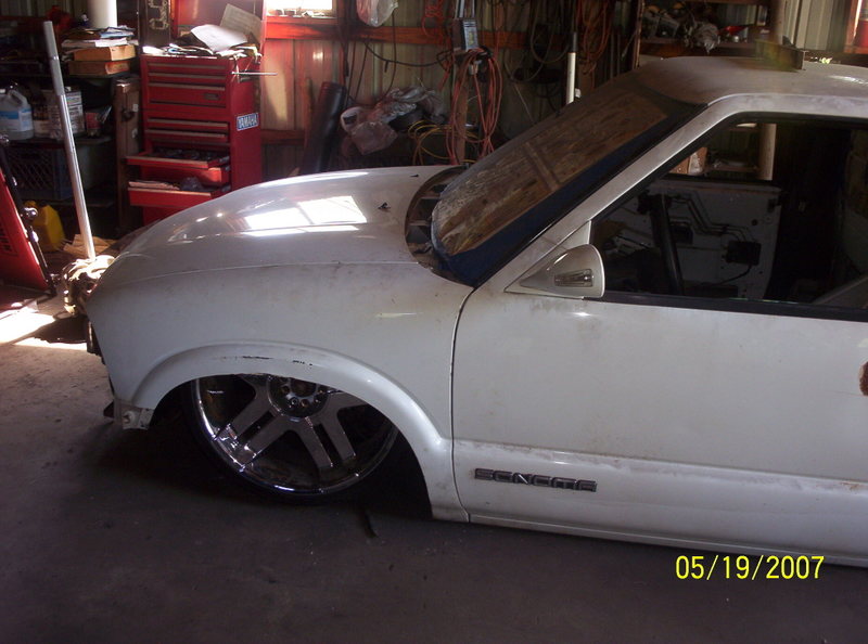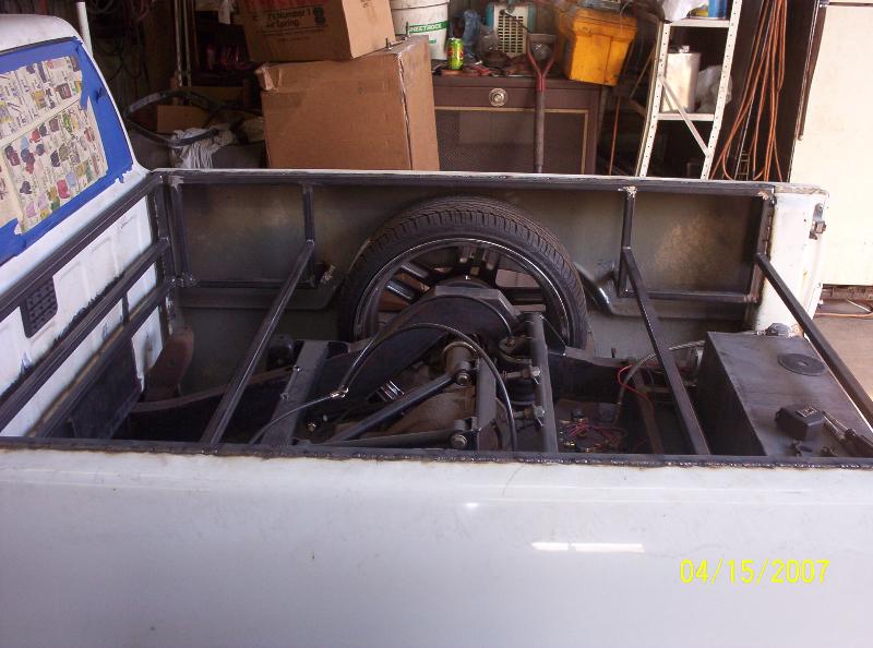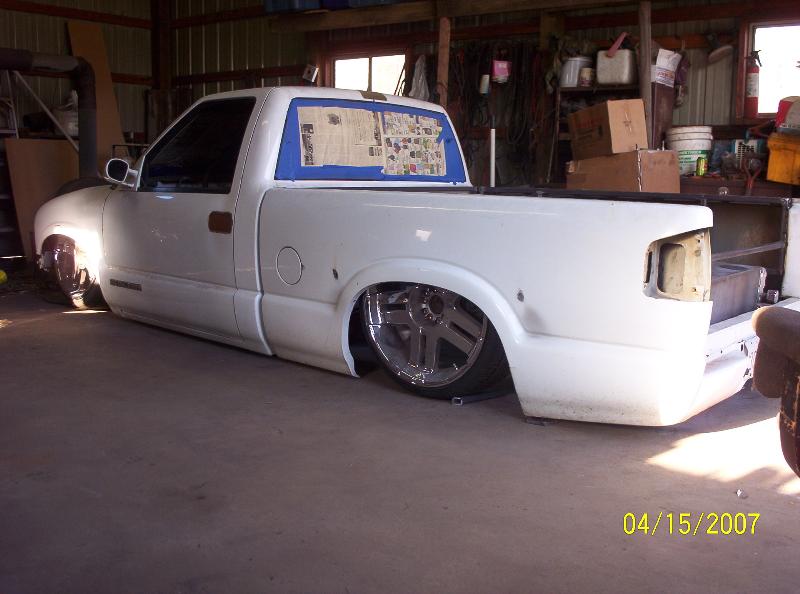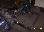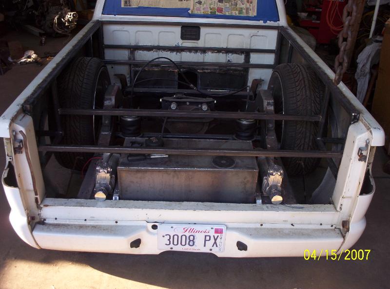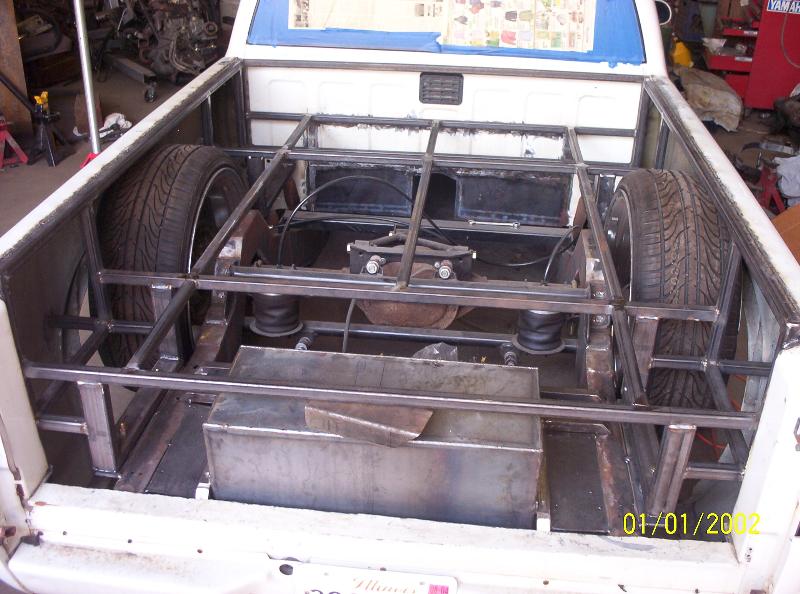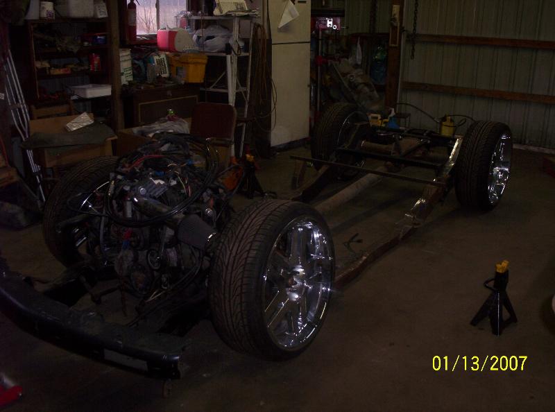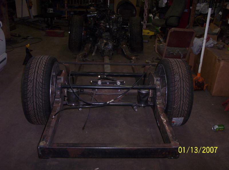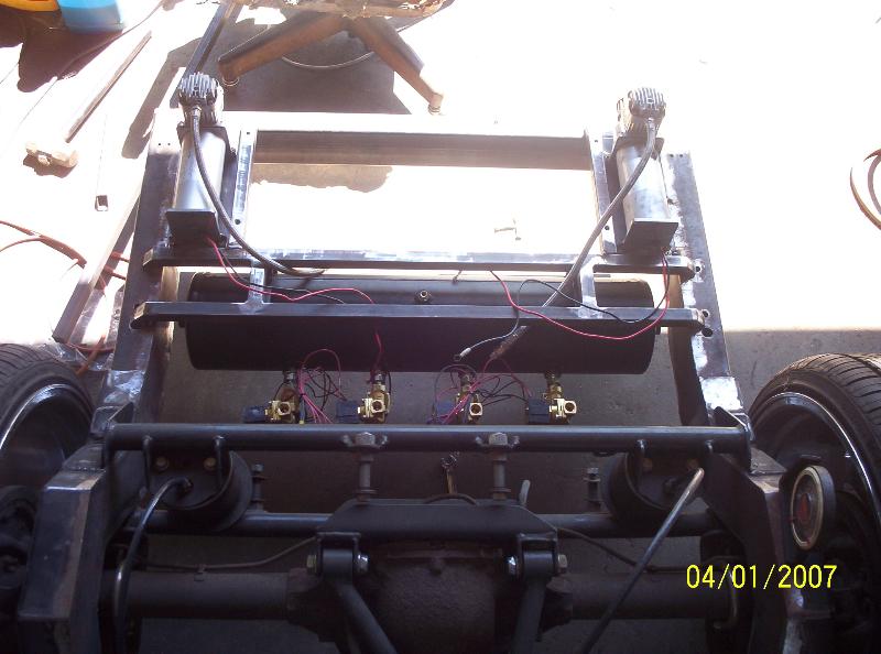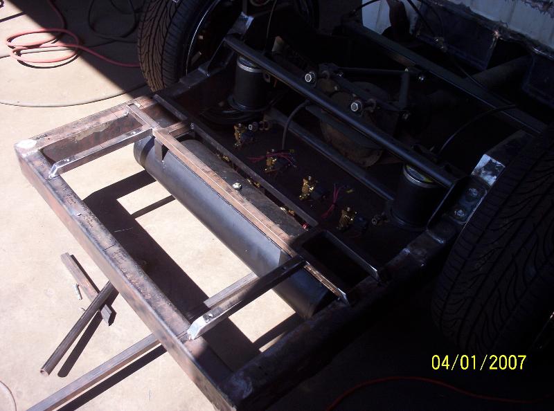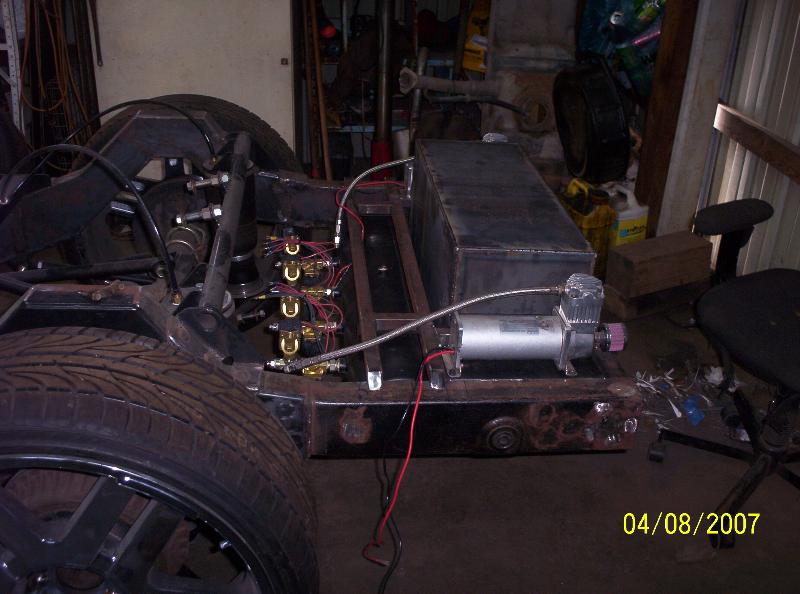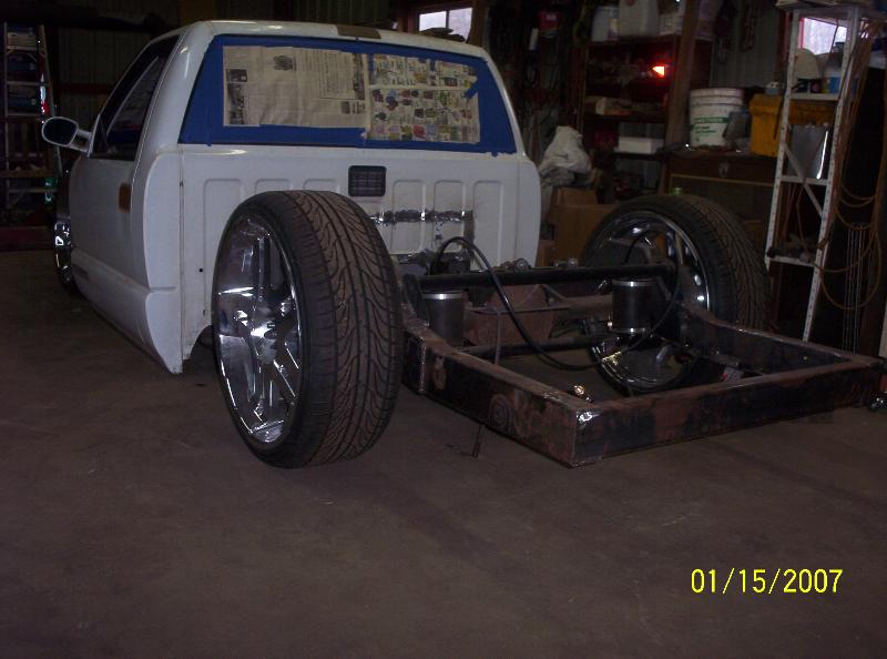 Front: Air ride technologys controlarms. 2600lbs. bags. Rear: Air ride technologys Road Greater kit.The frame is stock floored 3in. The rear has been welded in, smoothed, and the inside of frame plated. New Hooies fab shop transmisson crossmember. The frame work was done by Hooies Fab Shop.