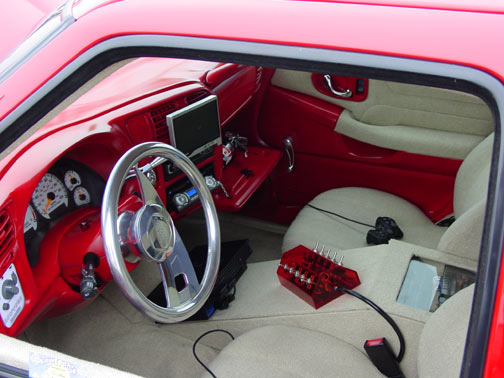 Finish the bed in tweed and mount stereo equipment. Billet Wiper post covers.