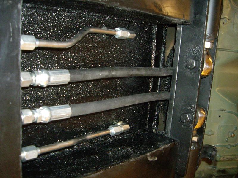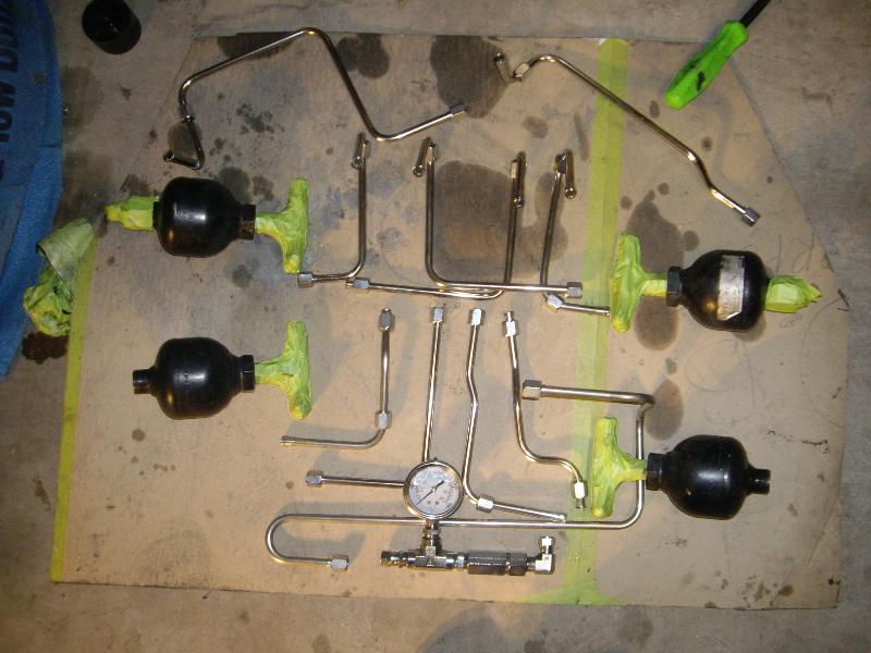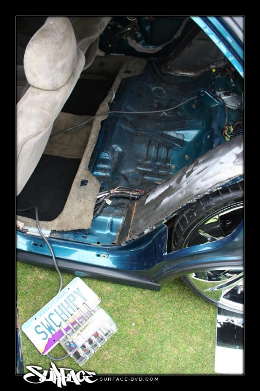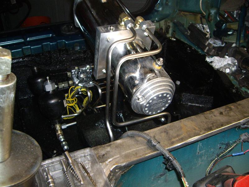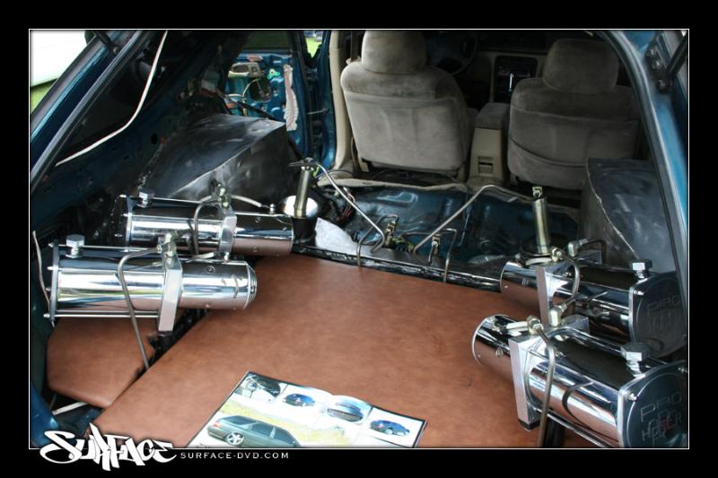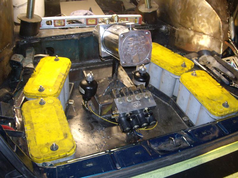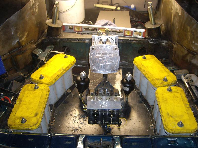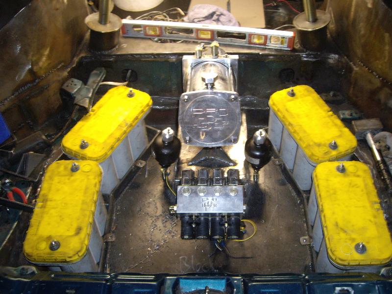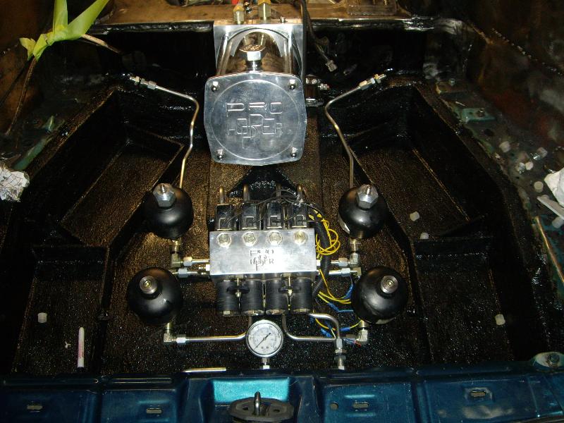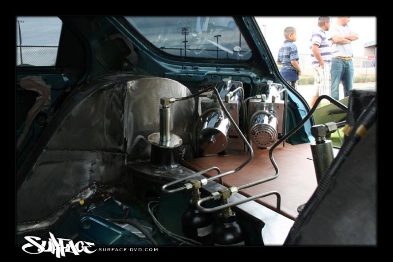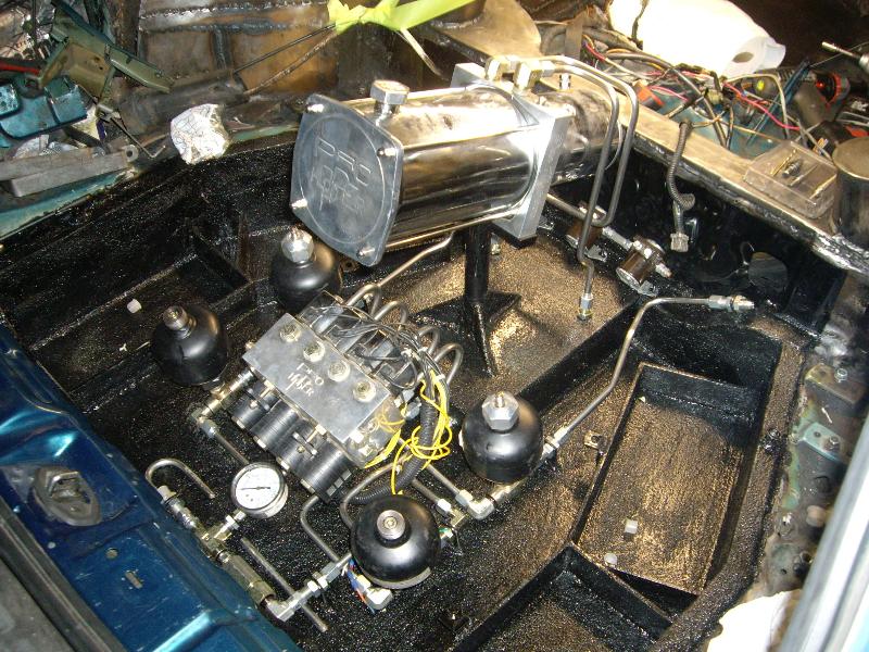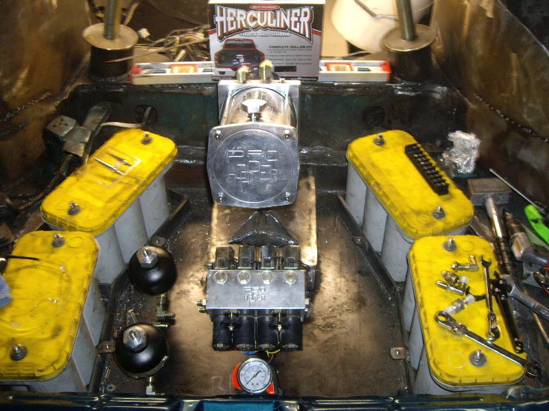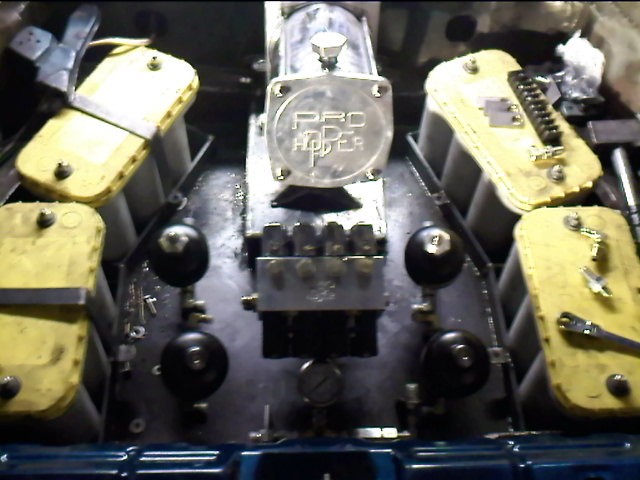 1 pump 8 dump pro hopper manifold, 8's in the Front, 12's in the Back with powerballs, 2 link rear arms made out of 1 3/4inch .250 wall DOM with 7/8 heims, 1/2 inch plate rear cradle Accumulators for a smooth ride, Parker fittings, Hardlined, 4 Optima D31A yellow top Batteries sunken in the the spare tire holder, Polished DC front strut bar, rear is tubed for 22's