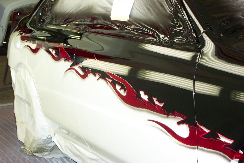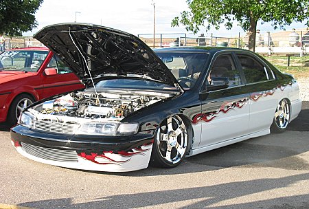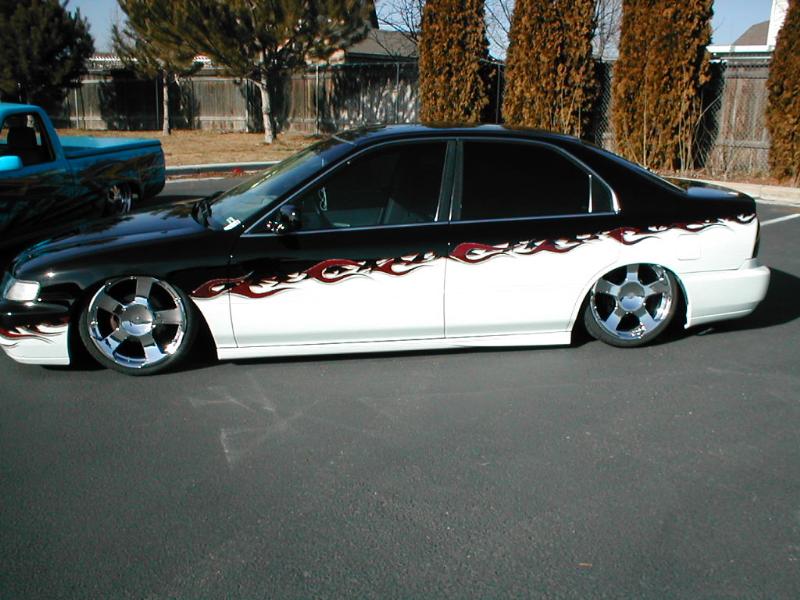 PPG Vibrance Crystal Black Top, Candy Apple Red Flames,Frost white Bottom, Blacked out lights all around, Trenz Billet Polished Upper/Lower Billet Grills, JDM Black-housing headlights, B/Clearcoat color matched (front-lip, side skirts, rear lower lip, Limo tint.