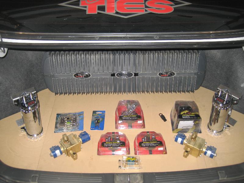 Panasonic CQ-VAD7200U 7" in dash DVD screen, Rockford tweets fiberglassed to mirror mount plate, Pioneer Premier 6.5's and 6x9's, Rockford Fosgate 750X 4-ch Amp, Rockford Fosgate Power 800.2 2-h amp, 2 12" Rockford Fosgate HX2's in full fiberglass enclosure.b Couple of chrome digital Rockford Capacitors... 0 Gauge wiring throughout