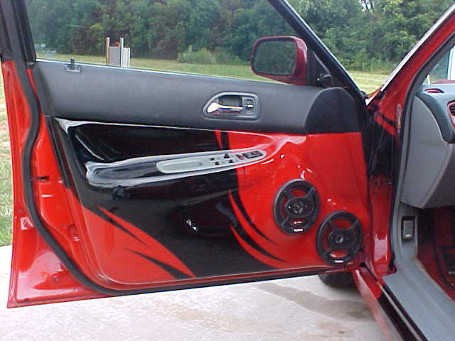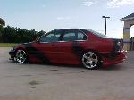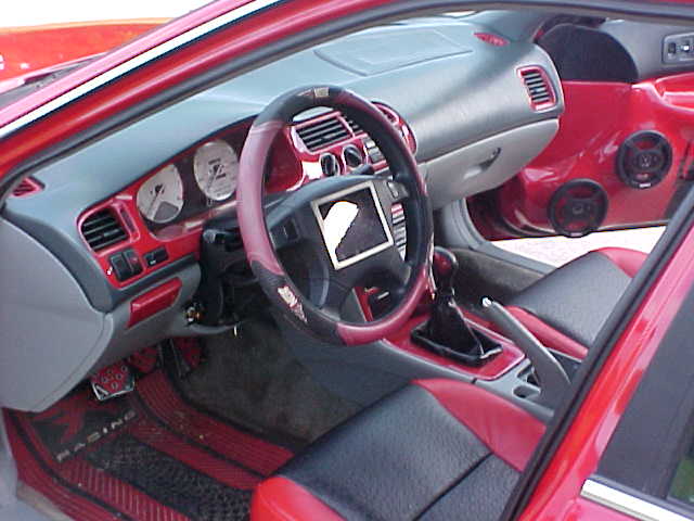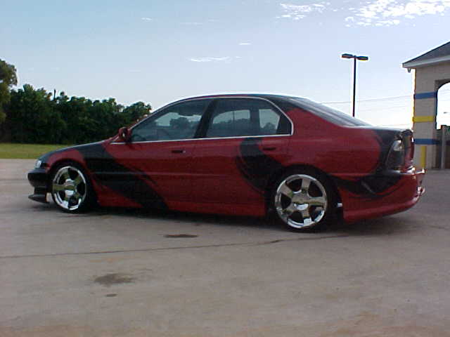 shaved gas door, relocated behind the taillight, tail light extends on an 8 inch actuator to reveal the gas filler, shaved antenna, paint is red and black tribal patterns, full spoilers etc. ninja body kit.