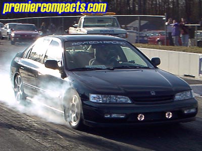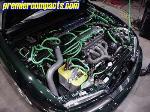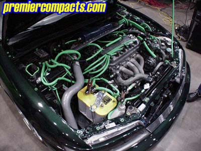 2.2L 4Cyl SOHC Vtec, AEM Intake, DC Sport Header, Greddy Catback SP Exhaust, ACT Street Organic Clutch, AEM Underdrive Pulley Kit, Aem Ajustable Cam Gear, Polished Valve Cover, Triple Chrome Plated 150 Amp Alternator, Hose Techniques Neon Green Show Kit, Various STR Polished Accessories, Steel Braided Hose Kit, Strobes, Green Neon, Optima Yellow Top Battery, we'll leave it at that.
