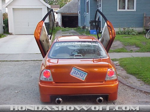 :showoff3 front bumper,blackwidow side skirts,buddy club rear bumper shaved door handles,shaved emblems,frenched lisence plate, candy orange paint,spoiler, carbon fiber hood, lamborghini doors