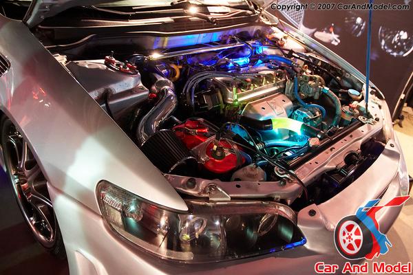 vtec,chrome braided hoses,cold air intake,strut bar,blue flex loom.red top optima battery,9.3 blue spark plug wires,NGK spark plugs,fully polished valve cover,custom hand made blown glass radiator hose and spiral vaccuum lines sponsored by Killer Glass