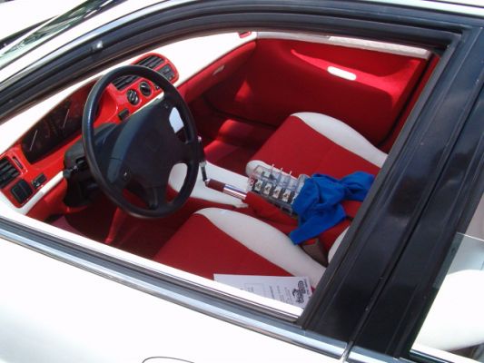 SOLD,white leather,red tweed