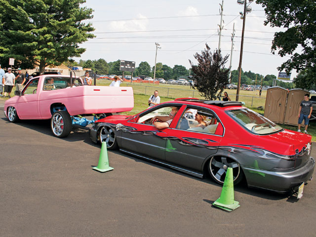 TUBE FRONT CLIP(lays flat unibody pan), redesigned rear suspension inside trunk w/ adjustable camber & toe, shocks all the way around, slim 5 gal. mounted on trunk underside, (sponosored by slam specialties), 2 AIR-ZENITHS