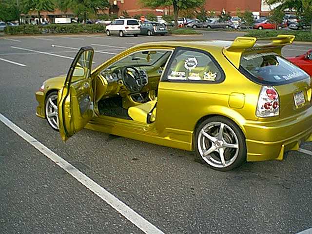wings west tuner series kit, shaved door handles, molding, back wiper, antenna, emblems, wiper squirters. side skirts molded in so there are no screws. paint is ppg kandy sunshine yellow on a silver base. commando wing with altezza taillights