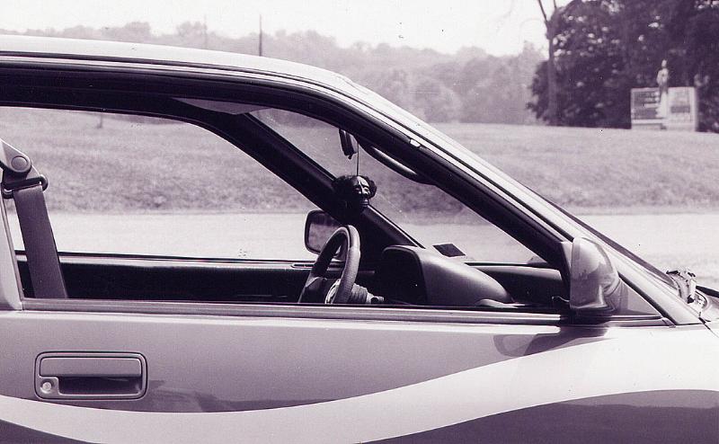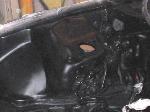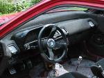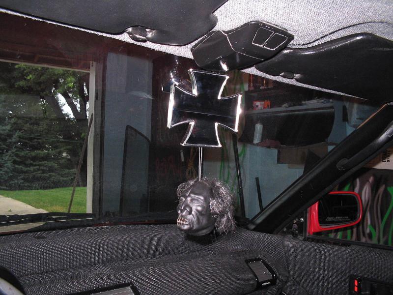 tweeded everything with dark and light gray, integra ls seats and center console with armrest, ichibahn pedals and floor plates, flamed tweed roof liner, billet shift knob and a monkey skull shift knob, custom rear half made to hold soundsystem and air ride components, hand pinstripped gauge cluster hood and rear hatch cover, billet moon eyes maltese cross mirror with shrunken head, raised "666" dice on rear cover behind seats