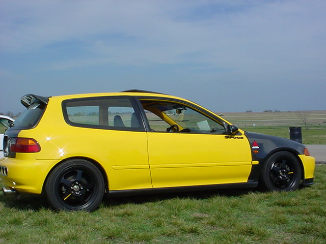 Complete color change to Sunburst Yellow inside and out.Shaved handles and antenna.Spoon Sports Carbon Fiber hood,fenders,rear wing and front chin spoiler.Spoon Sports Carbon-Fiber Door Pillars,and Power Mirrors. Custom Carbon Wrapped Tailgate. JDM EG6 SiR2 Head Lights w/H4 HID Conversion Kit, Stanley amber Side Markers Tail Lights and Vision amber Corner Lenses. JDM EG6 SiR2 Projector Fog Lamps. *Custom Reflective Spoon Graphics.