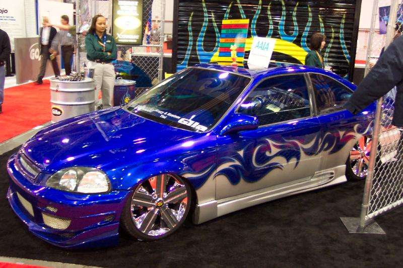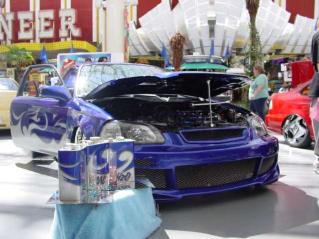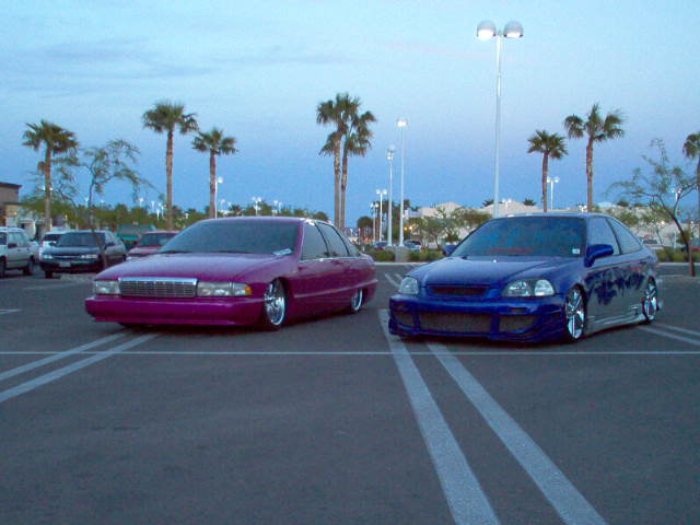 The Top half is HOK Makic Blue Pearl. and the bottom is a HOK Silver metalic something. All highlighted and shadowed through the Jams and Striped tribal style in Baby Blue. All so, shaved everything but the gas door. 2- 12" by 1/4" Hi-tech LED's for brakes. Body kit, JDM front lights. etc. All painting and Finish work Done By TENTEN CUSTOM PAINT of Las vegas