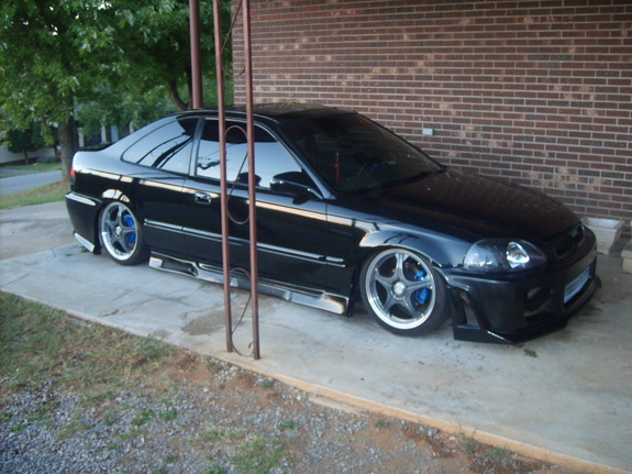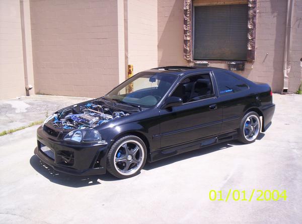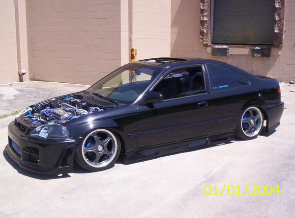 D16Y8 sohc v-tec with a cold ait intake,4-2-1 racing headers,high flow cat,2.5" piping into 4" tip,hyperground kit,9.33mm spark plug wires,polished valve cover,polished distibutor,polished fuel rail,clear distributor cap,chrome oil cap,chrome overflow tank,chrome battery tie downs,brushed aluminum battery tie down,polished transmission housing,chrome brake fluid resvoir cover,custom paint and an anodized blue radiator cap cover