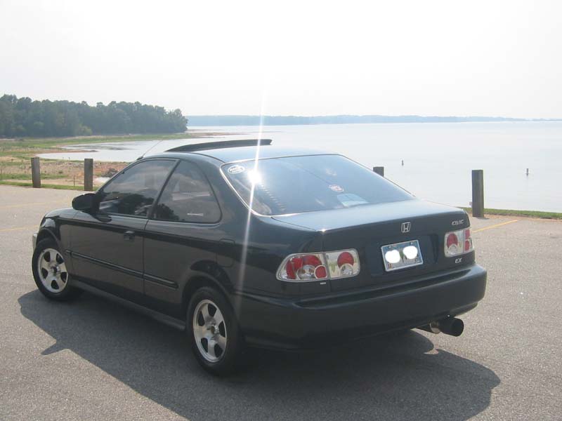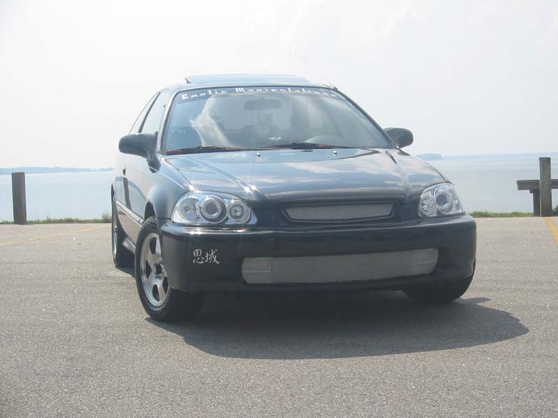 Black with Pin Stripe, Sunroof, Exotic Sticker, Next Generation Euro tails, Clear Projectors with Halos up front, Red Euro Blades, White Cobra Eyes windshield sprayers, White Street Glow Gold Series Underbody Ground Effects,Two white mesh grills installed into factory bumper, and 20% tint all around with 5% on the sunroof and the strip on the windshield, Lightweight Composite Spoiler with LED brake light, shaved all factory emblems, evil H with white neon glow