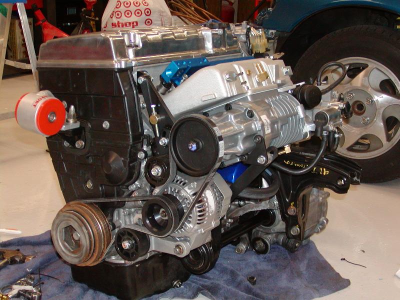 B16A, Hasport Motor Mounts, Hasport Shift Linkage, Port and Polished head, TypeR Intake Valves, Titanium Retainers, GSR Cams, Skunk2 Cam Gears, NGK Wires, AEM Fuel Rail, AEM FPR, Walbro 190 Fuel Pump, CenterForce Clutch, Y1 Trans., Jackson Racing Super Charger, Stepper Pulley to 10 lbs., Kamakaze 4-1 Header(w/ 3" Downpipe)Custom made with 2-O2 Bungs in the primary(not the one in the pics), 2.5" Greedy Catback, Polished Valve Cover.
