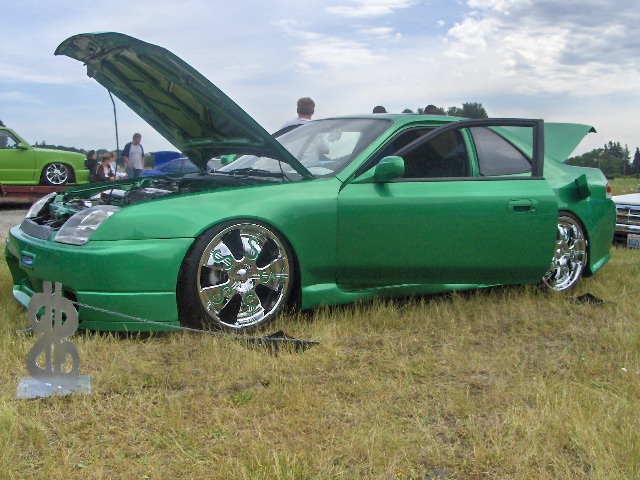 custom green paint with green pearl and gold flakes. R33 full body kit. Back bumper and side skirts molded. Trunk lid shaved emblem and trunk lock.
