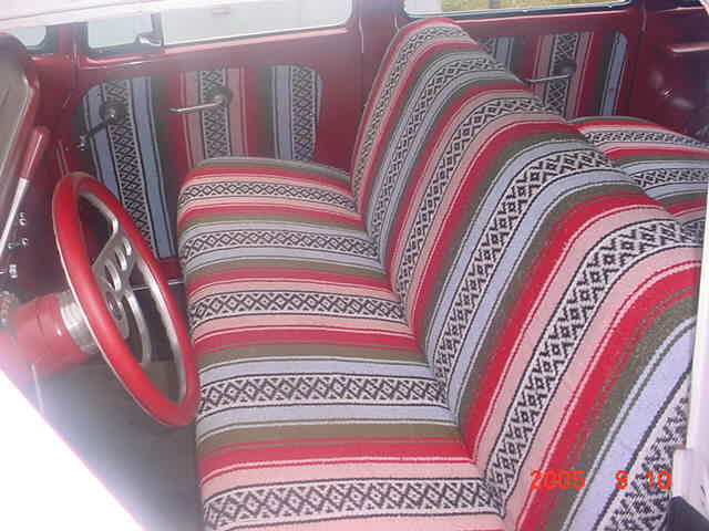 bomb canned red with mexi blankets hog ringed to the seats and rapped over the door panels , i built a dash insert with auto meter guages
