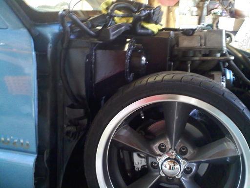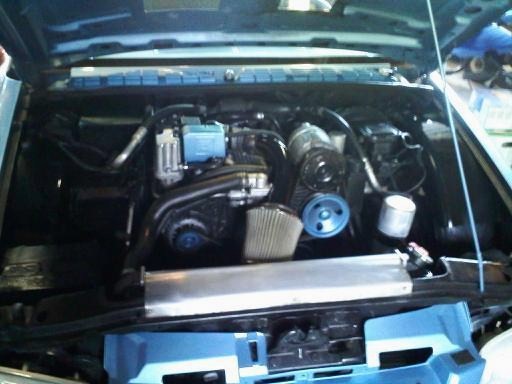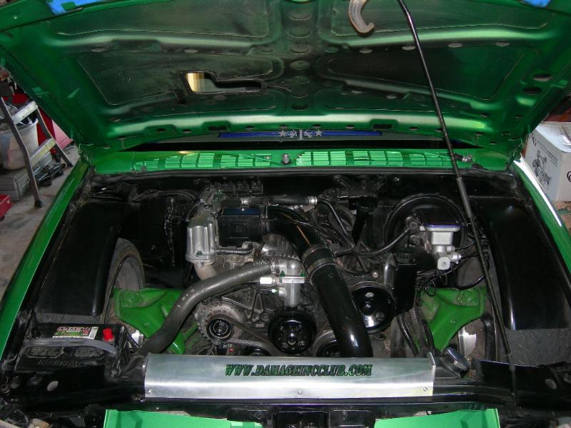 sheetmetal blower box, relocated computer, 2 electric fans, Turbo Muffler 2 1/2 dump exhaust all wrapped in header wrap with Z06 tip out the rollpan, raised clutch, painted parts, polished lines and intake manifold, etc.