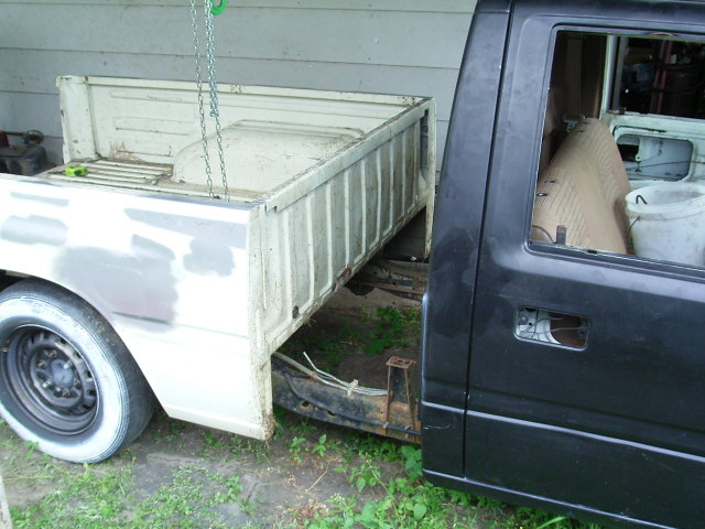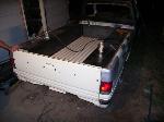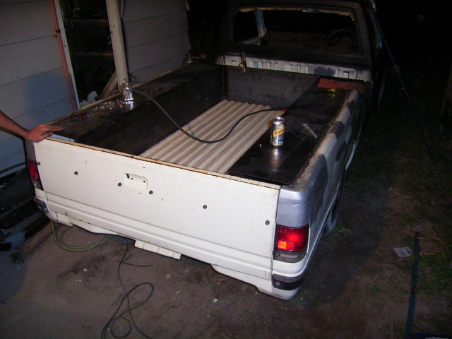 shaved bed, inc. fuel door, tie downs and the top of the tail lights, will have custom bed floor, and a combo skin, with nuber plate in the center, cab is now in primer ready for paint