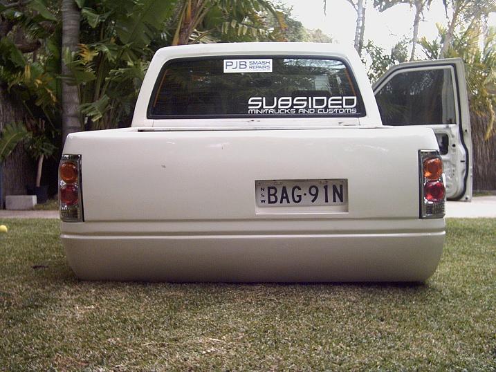 Shaved door handles , blinkers , whole tray , ariel. Welded shut tailgate , all lights are euros.