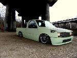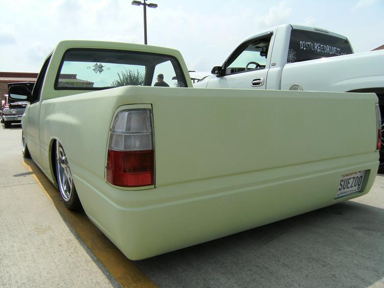 HOK Mint Green,shaved handles,mirrors,gas door,hood pissers,emblems,corners,bed seams.Rodeo door panels,Aussie Tails,Grant combo & license box,Sectioned/Smoothed & molded 4x4 Yota bumper/valence,Sheetmetal bed floor & wheels tubs,RCI 15 Gal. Fuelcell
