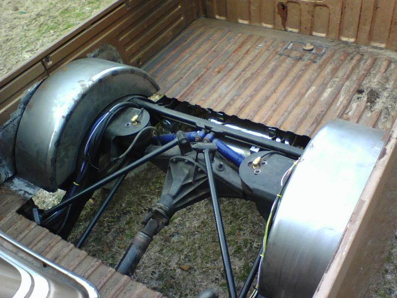custom tubular uppers, severly modded lowers, completely removed shock tower, will lay on 19' or 20's if i took the torsions back out, oh yeh and a 3" block in the rear