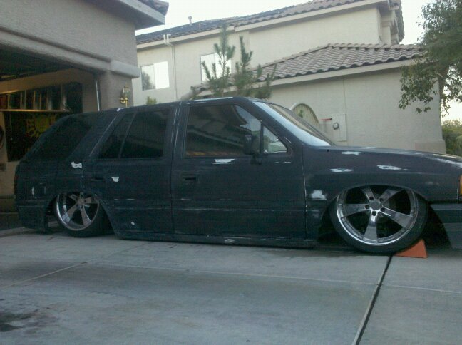 Stock Floored frame, 85 Toyota SR5 front clip, 90 Toyota Supra rear suspension. Sitting on Firestone 2500 and 2600 Bags. Cantilever setup on the Supra rear.