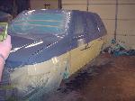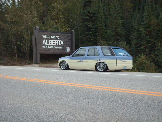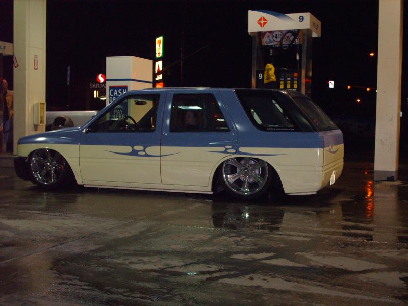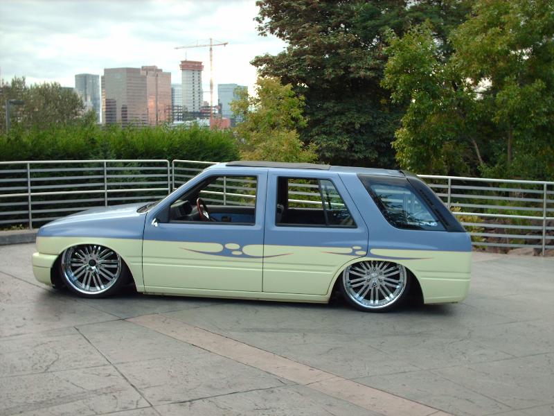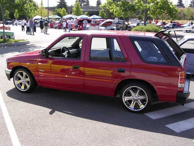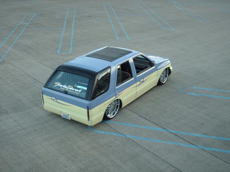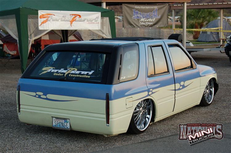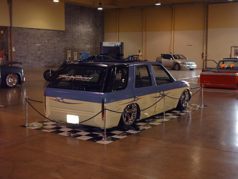 Amigo front end swap. Shaved corners(These fuckers were a night mare. We got 9 Hours into each side just in metal work. As little filler as possible. Thanx Jeff from "JRS Customs", couldnt have done it with out you!), antenna. hood squirters, and emblems. Ford Ranger headlights with a Trenz Toyota Phantom billet (cut down). One off/one pieced front bumper. Shaved the taillights, lower rear rocker corners, spare tire mounting holes, and handles. It has full one-off rear skin combo(thanx Mother Goose Customs) and caddy's with a plate box. Shaved mirrors(replaced with chrome Buell motorcycle mirrors), third brake light, lightbar mounts, and roof rack. 66" x 36" StreetBeat rag. Every thing is primed with custom mixed Sherwin Williams "Passion Purple" and "Mello Yellow" with a cool graphic breaking it up.....Thanks again Jeff at JRS Kustoms.