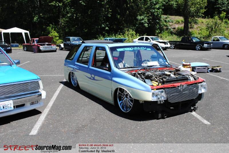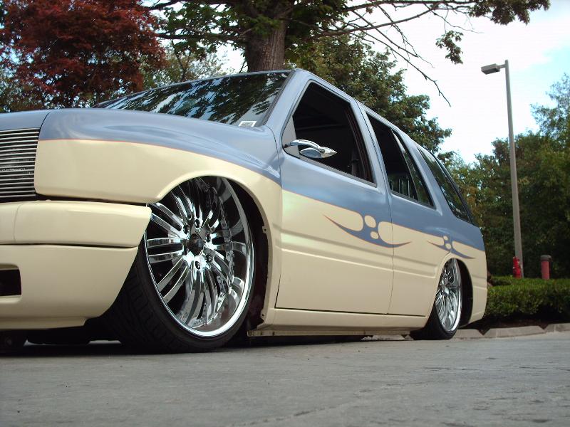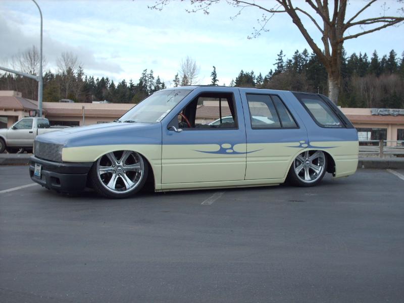 Bodydropped 2 1/4 inches traditional. Thanks to Jay with Fab-Lab and the crew at Advanced Auto Design in Auburn . Bagged front and rear with 2600lb Slam's(thats right, you read correctly, 2600's up front too). This thing gets some crazy mad lift. Its NUTZ! Thanx, Jay from "FAB-LAB". We swapped out a '91 Space cab front clip from the firewall fwd and z'd it up 2 inches while we were at it. The rear was notched and the floor was raised 5.5 inches to cover it all up again. I replaced the rear end with one out of an '87 spacecab which allowed me to get enuff room to get the tires all the way up without rubbing the outer skin. It was all bolted to a solid 2-link that was made by Mothergoose Customs up in Canadia and all welded in by me and Jay. The rear door jams and doors were cut out to give the rims room typical 4-door suv style. Trailer tubs were put in and I am waiting to finish the doors and jams until the bodydrop gets done. A set of 2" drop spindles from Aim finished laying the frame flat on the ground. The entire system is controlled by the Pressurerite system from FAB-LAB. I'll put some new pics up soon.