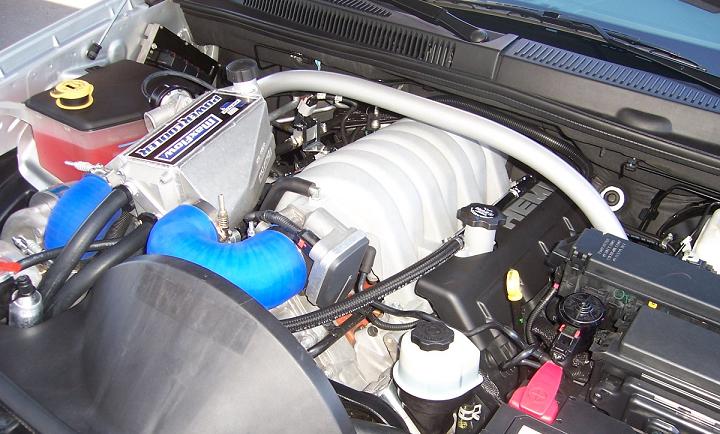 6.1L HEMI with a Vortech 8.5 psi Blower, MSD Ignition, Lager Fuel injectors, Fuel Pump up-grade, Water to air & air to water innercoolers, B&B cat back exh and its All WHEEL DRIVE 560-580 hp. no dyno yeat.