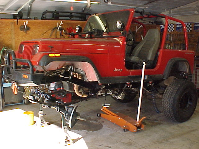 lift shackles in the front, revolver shackles in the rear, pro comp 4 inch lift springs, sprung over on a full width dana 44, and corporate 14 bolt rear, welded front and rear