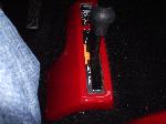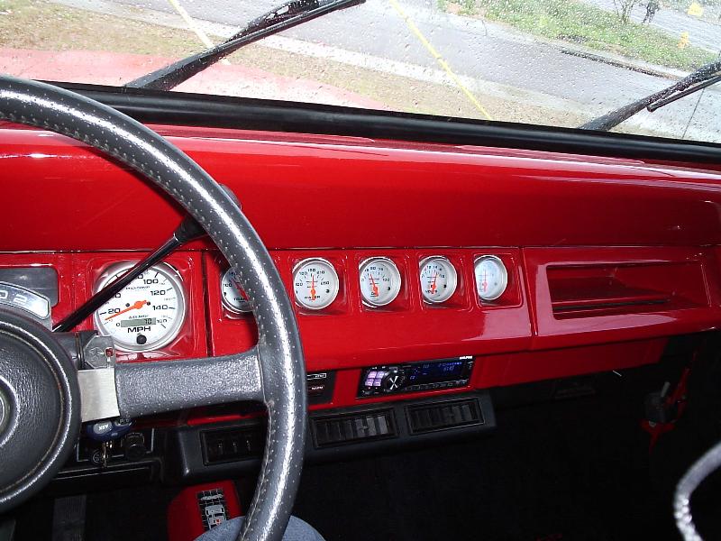 factory dash modfied to hold autometer gauges, painted dash, black carpet kit, with suede door panels, black and black suede leather seats all piped in red.