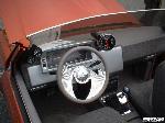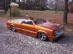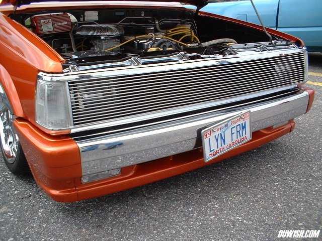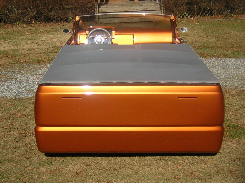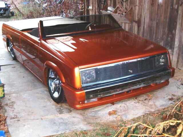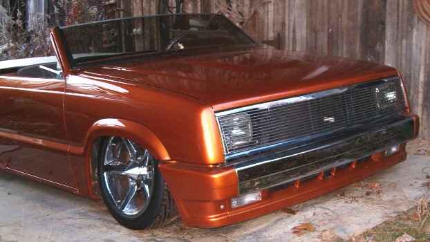 The exterior of the truck consists of shaved everything (door handles, gas door, taillights, corner lights, wiper cowl, emblems, and antennae)phanton billet grille, and the top of the doors and cab are capped off. The top has been removed making it a full time convertible and has a lexan windshield. It has 6 inch HiTech LED taillights and H4 headlights, with Harley-Davidson style side mirrors. The truck was just painted Blazing Copper Pearl (new Mazda color) in Sept. ‘04, Truck was black, grey, green, and blue. It has a 2600i hood and a gray vinyl bed cover that matches the interior.