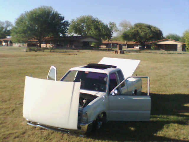 MY TRUCK HAS EVERYTHING SHAVED, FRONT TILT HOOD, 3 IN. BODY DROP, 4X4 FENDERS, AND A RAG TOP
