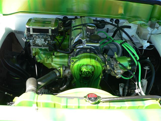 Front frame shaved and painted. Stock rebuilt bored .30 over, weber 38/38, mild cam, pacesetter ceramic coated headers, flex-a-lite electric fan, all parts painted, and polished. Tubbed, shaved and painted. Thanks to Steve at Nevets Kustoms