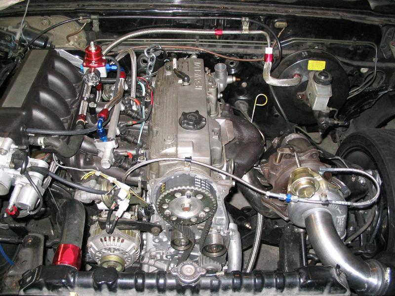 F2T 2.2l with Subaru STi VF22 Turbo, bored over, ported and polished, intake/ exhaust blend, bored throttle body, custom cam, intake flip, custom adjustable cam gear, Shadbolt cam, lightweight crank pulley, 3" downpipe, Megasquirt standalone engine management