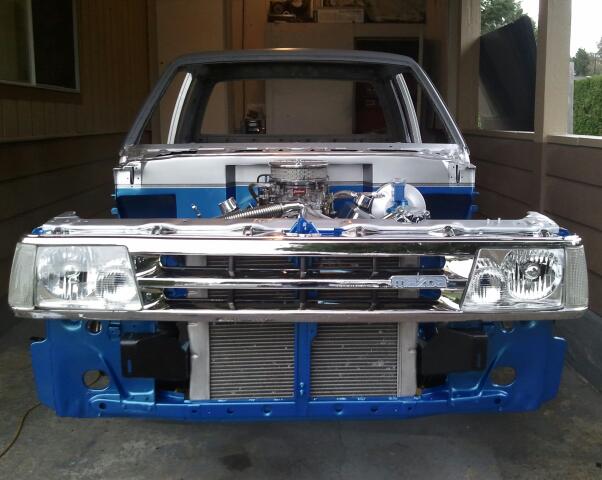 Body dropped 2 1/2 inches laying pinch, Sliding rag top, shaved everything, frenched atenna in rear quarter, 04 ranger headlights, toyota 4runner front bumper, blue and silver two tone paint, 4x4 hood.