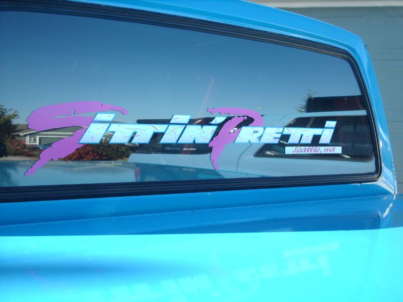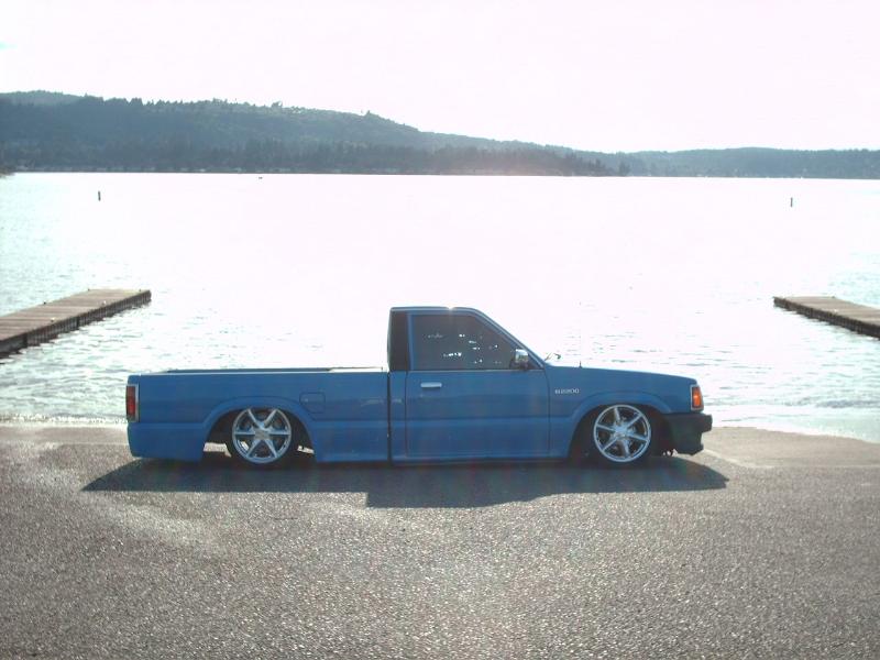 Completly replaced the bed floor and bodydropped it all the way up. Shaved the antenna hole, cab seems, gas filler door (relocated to center of filler panel under bed floor and access by dropping the tailgate). Added a roll pan and frenched in the plate box. B2600 hood and custom paint by JRS Kustoms. Mazerati blue on top with pure white on the bottom, broker up by 4 coats of candy magenta traditional flames with real fire inside. Pinstriped by Dave with Austin Pinstripeing. All graphics and stripes into the jams. Thanks Jeff. Sponge says your gay!